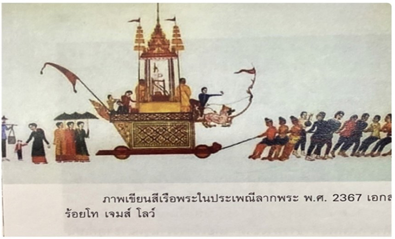 ภาพ “เรือพระ” มีล้อลากอยู่บนบก มีพระพุทธรูปบูชา และพระสงฆ์กลางลำเรือ มีนางรำ อยู่หน้า ท้ายเรือมีคนเป่าแตรประโคม ขบวนเรือชักพระมีคนตีฆ้องให้จังหวะ ชายโพกหัวเหมือนแขกอินเดียแบกร่ม สุดปลายเชือกเป็นแขกมลายู ด้านท้ายเรือหญิงมลายู 4 คน ในชุดกระโปรงยาวถือร่ม ท้ายขบวนคนจีนใส่หมวกกุ้ยเล้ยกำลังหาบคอนสิ่งของ