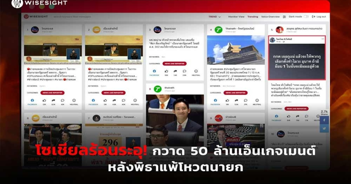 เรียกได้ว่านาทีนี้คงไม่มีเรื่องใดเป็นประเด็นแห่งชาติได้เท่าการโหวตนายกรัฐมนตรีคนที่ 30 ของไทย ตลอดทั้งวันที่ 13 กรกฎาคม ที่ผ่านมา ชาวโซเชียลให้ความสนใจกับการโหวตเลือกนายกฯ ตั้งแต่ช่วงเช้าจนกระทั่งประกาศผล จนดันให้หลายๆ แฮชแท็กทั้ง #โหวตนายก, #นายกพิธา, #ประชุมสภา, #เลือกนายกตามผลเลือกตั้ง เบียดกันติดท็อปเทรนด์ทวิตเตอร์นาทีต่อนาที และมีข้อความไหลไม่ต่ำกว่า 100,000 ข้อความ! และเมื่อผลประกาศออกมาว่า พิธา ไม่ได้เป็นนายกฯ ก็ทำให้กระแสการพูดถึงเกิดขึ้นตลอดทั้งคืนวันที่ 13 กรกฎาคม