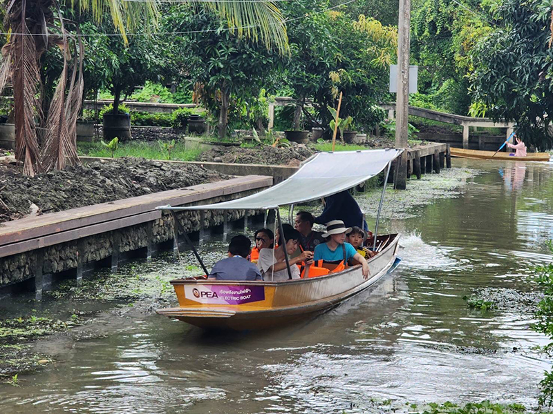 วิธีการคือ ใช้รถยนต์ให้น้อย ใช้เรือท้องถิ่น ในกรณีนี้มีเรือหางยาวไฟฟ้า ที่ใช้แบตเตอรี่ที่ชาร์จจากแผงโซลาร์เซลล์บนหลังคาเรือ แล่นเงียบ ไม่มีควัน คลื่นกระทบตลิ่งและเสาเรือนชาวบ้านเบาหวิว เป็นพาหนะ