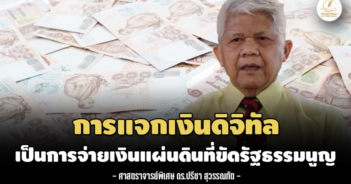 การแจก “เงินดิจิทัล” จึงเป็นการขัดต่อวินัยทางเศรษฐศาสตร์การเงินและการคลังตามความเห็นของนักวิชาการด้านเศรษฐศาสตร์ และขัดต่อรัฐธรรมนูญ พุทธศักราช 2560 มาตรา 140 ที่มีมาตรา 5 บัญญัติไว้ว่า “รัฐธรรมนูญเป็นกฎหมายสูงสุดของประเทศ บทบัญญัติใดของกฎหมาย กฎหรือข้อบังคับ หรือการกระทำใดๆ ขัดแย้งต่อรัฐธรรมนูญ บทบัญญัติหรือการกระทำนั้นเป็นอันใช้บังคับมิได้”