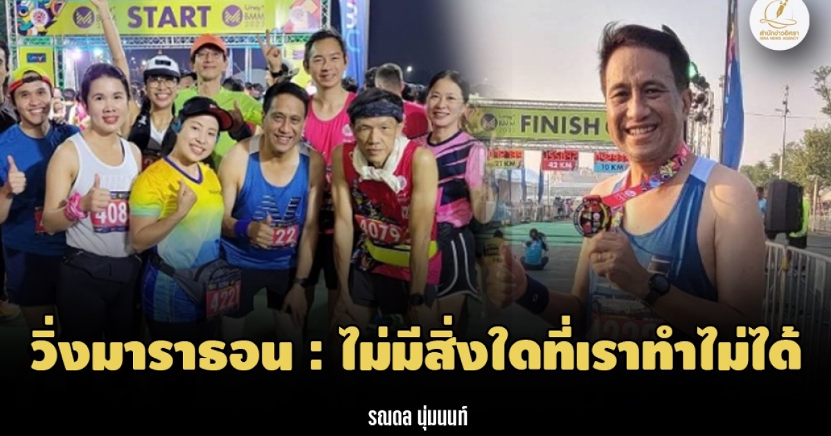 และแล้ววันวิ่งได้มาถึงแบบตั้งตัวแทบไม่ทัน คนรอบ ๆ ข้างเตือนสติว่า “พี่ครับ มาราธอนไม่ได้มีแค่ครั้งเดียว ไม่ไหว ก็ไม่ต้องฝืน” เราเริ่มต้นวิ่งจากท้องสนามหลวงเวลา 1.45 น. วิ่งไปตามความเร็วที่ตั้งใจไว้ โดยมีน้องอุ้งวิ่งประกบ คอยบอกตลอดเวลา เช่น ทางขึ้นให้เดินขึ้นแทนเพื่อผ่อนแรง และทุก 2 กิโลเมตร ให้หยุดจิบน้ำ เรียกว่า วิ่งไปได้เรื่อย ๆ จนสุดทางยกระดับฯ ก่อนย้อนกลับมาลงสะพานพระราม 8 แบบสบาย ๆ แต่เมื่อถึงถนนราชดำเนิน และต้องวิ่งไปทางสะพานซังฮี้ พร้อมกับเห็นนักวิ่งเริ่มสวนทางวิ่งไปเส้นชัย เริ่มใจหวั่น ๆ ขารู้สึกล้า ๆ ใจงอแง เริ่มหยุดเดินบ้าง ถือเป็นภาวะที่คนวิ่งรู้จักกันดีว่า “ภาวะชนกำแพง” เพราะจะรู้สึกเหมือนกับมีโซ่ตรวนมาลากขาไว้ เรียกว่าช่วงนั้นต้องใจสู้สุด ๆ แต่กัดฟันวิ่งแบบเหยาะ ๆ ไปเรื่อย ๆ จนเห็นสนามหลวงอยู่เบื้องหน้าทราบแล้วว่าเราทำได้แม้จะต้องวิ่งรอบสนามหลวง 1 รอบ วิ่งถึงเส้นชัยพร้อมกับเสียงกองเชียร์ที่รออยู่ จบด้วยเวลา 5 ชั่วโมง 58 นาที ต่ำกว่า 6.30 ชั่วโมง ที่เป็นช่วงตัดตัวนักวิ่ง (cut off time)
