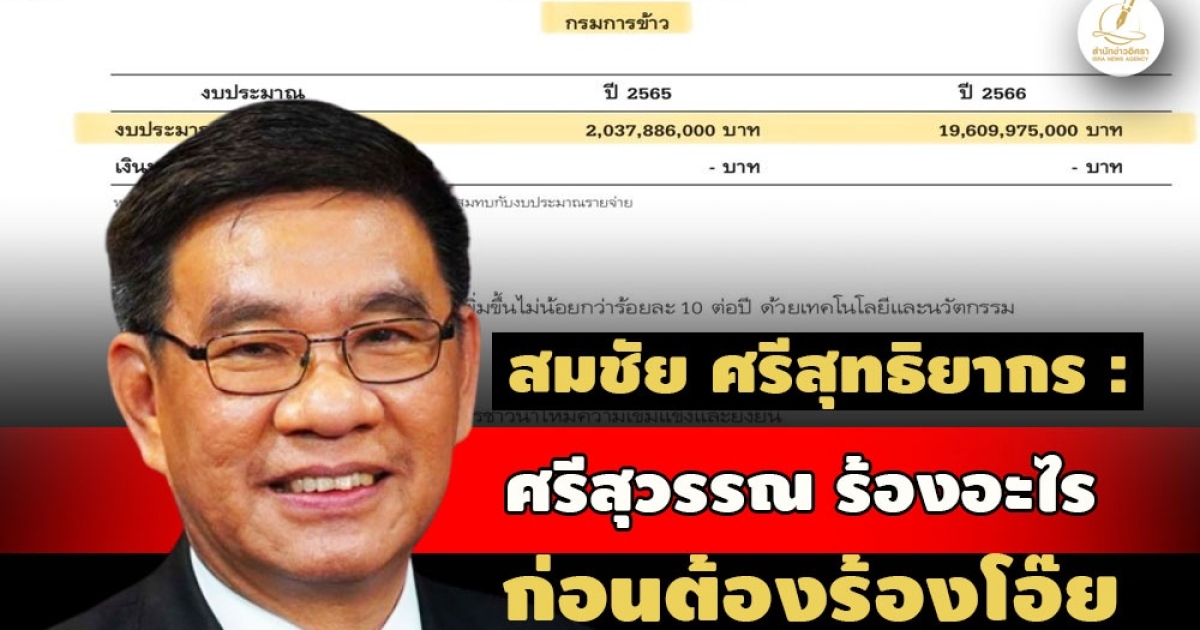 หมายเหตุ สำนักข่าวอิศรา (www.isranews.org) : เมื่อวันที่ 27 ม.ค.2567 นายสมชัย ศรีสุทธิยากร อดีตกรรมการการเลือกตั้ง (กกต.) โพสต์ข้อความผ่านเฟซบุ๊กส่วนตัว สมชัย ศรีสุทธิยากร อ้างข้อมูลเกี่ยวกับการตรวจสอบข้อมูลการใช้งบประมาณของ กรมการข้าว 19,609 ล้านบาท ซึ่งเป็นผลทำให้ นายศรีสุวรรณ จรรยา ผู้นำองค์กรรักชาติรักแผ่นดิน ถูกจับกุุมจากกรณีเรียกรับเงินอธิบดีกรมการข้าว 1.5 ล้านบาท แลกกับการไม่ร้องเรียน