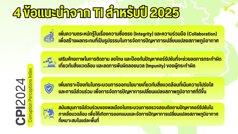 โดยทิศทางที่องค์กรเพื่อความโปร่งใสนานาชาติให้ความสำคัญในปี 2025 คือคอร์รัปชันกับวิกฤตการณ์การเปลี่ยนแปลงสภาพภูมิอากาศ ซึ่งถือเป็นเทรนด์สำคัญที่ต้องจับตามองและต้องส่งเสริมให้เกิดแนวทางการดำเนินการที่มีประสิทธิภาพมากยิ่งขึ้นในอนาคต
