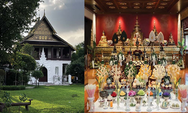 ศาลาจตุวรโพธิเป็นงานศิลปะล้านนาร่วมสมัย ภายในมีความเรียบง่าย เวลามองเข้าไปจะเห็นเป็นรูปทรงที่มีความสมถะ และเมื่อย่างก้าวเข้าไปจะรับรู้ถึงความสงบ มีพระพุทธสิงห์หรือพระพุทธสิหิงค์ เป็นพระประธานประดิษฐานอยู่ ซึ่งเกิดจากคุณขวัญได้มีโอกาสไปนั่งสมาธิต่อหน้าพระพุทธสิงห์ และมีความรู้สึกว่า พระพุทธองค์นี้ช่างงามเหลือเกิน จึงขออนุญาตพระเทพสิงหวราจารย์ เจ้าอาวาสวัดพระสิงห์ หล่อพระพุทธสิงห์เพื่อนำลงมาประดิษฐานที่บ้าน จนได้ฤกษ์ทำพิธีบวงสรวงและขึ้นไปทำพิธีหล่อพระสิงห์เนื้อสำริดขนาด 32 นิ้ว บนวัดพระธาตุดอยสุเทพ เมื่อวันที่ 26 มีนาคม 2566 โดยมีพระธรรมเสนาบดีเจ้าอาวาสวัดพระธาตุดอยสุเทพ เป็นประธาน พร้อมกันนี้ ยังได้รับพระเมตตาจากสมเด็จพระสังฆราช และพระสงฆ์ชั้นผู้ใหญ่มอบแผ่นเงินและแผ่นทองคำมาเป็นชนวนหล่อพระ คุณขวัญกล่าวว่า สำหรับพุทธศาสนิกชนชาวล้านนามีจิตศรัทธากราบไหว้พระพุทธเจ้าเสมือนท่านยังมีพระชนม์ชีพอยู่ ดังนั้น จึงมีการทำพิธีเหมือนชาวล้านนา พร้อมนำสัตภัณฑ์ไว้ภายในองค์พระสิงห์อีกด้วย