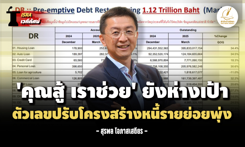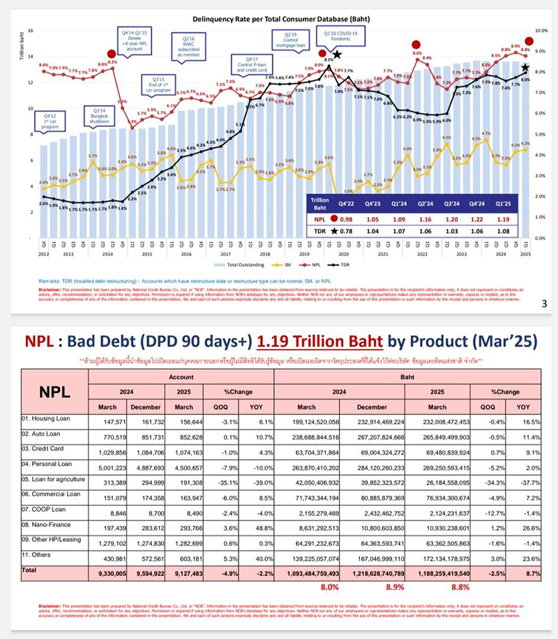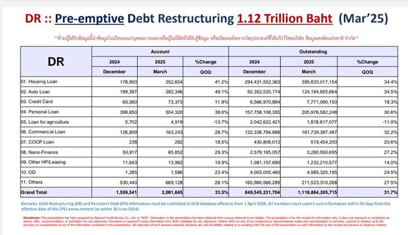 "...สิ่งนี้มันสะท้อนได้บ้างว่า คนเป็นหนี้, ไปไม่ไหว, ผ่อนติดขัด เจ้าหนี้ถูกกติกาบังคับให้ต้องยื่นข้อเสนอให้ลูกหนี้ทำ DR.ตัวเลขมันขึ้นเร็วมากจากการรายงานครั้งแรกเมื่อเมษายน 2567 เขื่อนยักษ์ DR.มันจึงยกสูงกั้นการไหลมาเป็น NPLs.อย่างที่เห็นกัน..."