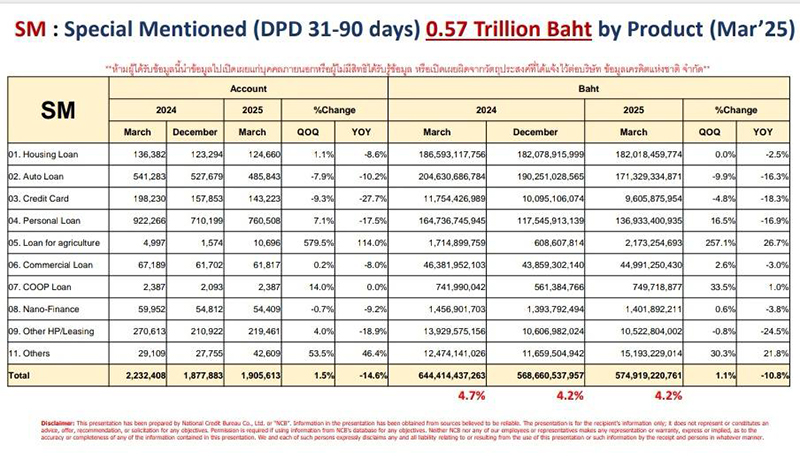 หนี้กำลังจะเสียหรือ SM.ก็อยู่ในระดับที่ 5.75แสนล้านบาท เทียบกับไตรมาสเดียวกันปีก่อนก็อยู่ที่ 6.44แสนล้านบาทลดลงมา เมืีอเทียบกับช่วงเวลาเดียยกันของปีก่อนหน้า(yoy )10.8%