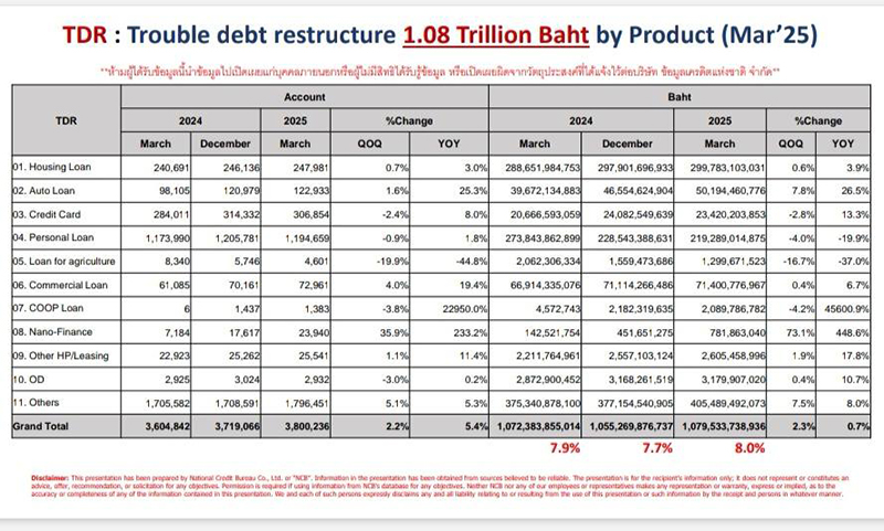 การเร่งปรับโครงสร้างหนี้หลังเป็นหนี้เสียหรือทำ TDR.นั้นมียอดคงค้าง 1.08 ล้านล้านบาทเทียบกับช่วงเวลาเดียวกันของปีก่อนก็อยู่ที่ 1.07 ล้านล้านบาท yoy.แทบไม่ขยับ
