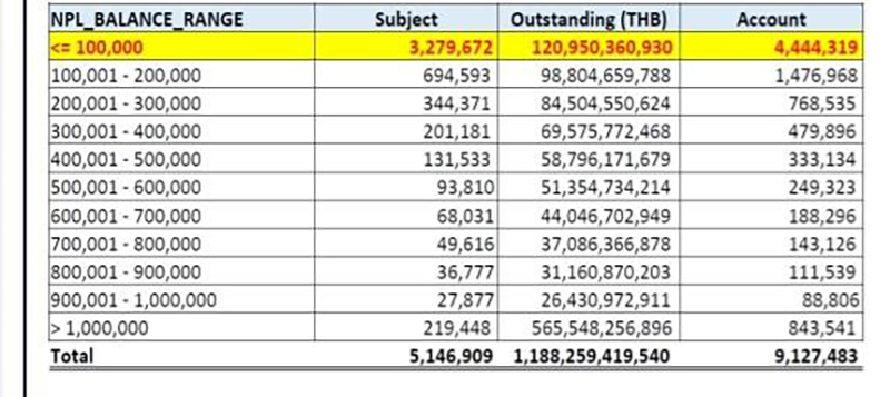 เจาะลงมาในหนี้เสียตั้งแต่ 1 แสนบาทลงมาพบว่ามีอยู่เป็นจำนวนเงิน 1.2แสนล้านบาทหรือประมาณ 10%ของยอดหนี้เสียนั้นครอบคลุมจำนวนรายของคนที่เป็นลูกหนี้ 3.28ล้านคน,4.44ล้านบัญชี