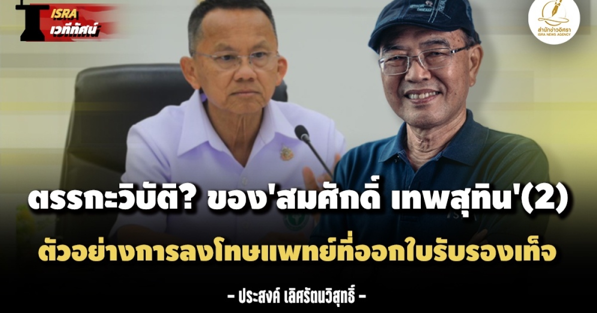 ตอนที่แล้วเขียนถึงเหตุผลที่นายสมศักดิ์ เทพสุทิน รัฐมนตรีว่าการกระทรวงสาธารณสุข ในฐานะสภานายกพิเศษ แพทยสภา ได้ทำความเห็นยับยั้ง หรือ วีโต้ มติแพทยสภา ที่ให้ลงโทษแพทย์สามรายกรณีป่วยทิพย์ ของ นายทักษิณ ชินวัตร เพื่อจะได้พักรักษาตัวที่ชั้น 14 โรงพยาบาลตำรวจ โดยไม่ต้องถูกจองจำในเรือนจำโดยอ้างหลักการพื้นฐานในการพิจารณาว่า