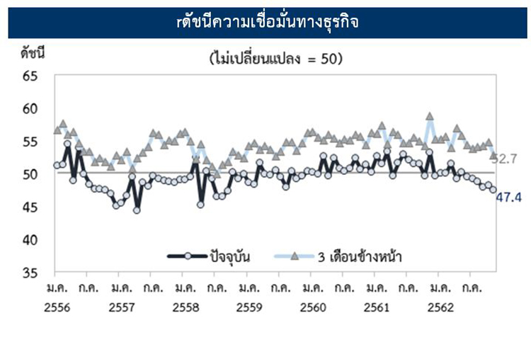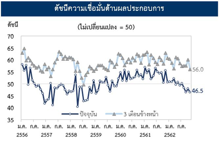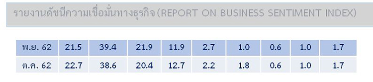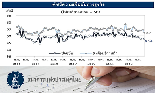 "...ดัชนีความเชื่อมั่นทางธุรกิจเดือน พ.ย. 2562 ปรับลดลงจากเดือนก่อนมาอยู่ที่ 47.4 จากความเชื่อมั่นที่ลดลงในภาคการผลิตเป็นสำคัญ โดยดัชนีฯ ของภาคการผลิตยังอยู่ต่ำกว่าระดับ 50 เป็นเดือนที่ 8 ติดต่อกัน ขณะที่ความเชื่อมั่นของภาคที่มิใช่การผลิตทรงตัว ในอีก 3 เดือนข้างหน้า ดัชนีฯ ปรับตัวลดลงมาอยู่ที่ 52.7 จากมุมมองเชิงบวกที่ปรับลดลงในเกือบทุกองค์ประกอบ โดยเฉพาะด้านปริมาณการผลิตและผลประกอบการ..."