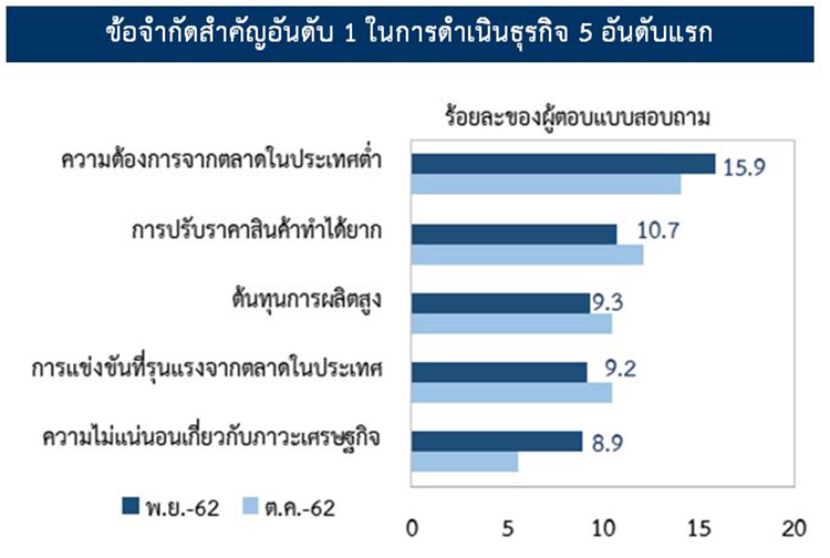 • อุปสงค์ในประเทศต่ำยังคงเป็นข้อจำกัดสำคัญที่สุดในการดำเนินธุรกิจในเดือนนี้ สอดคล้องกับความเชื่อมั่นด้านคำสั่งซื้อของลูกค้าในประเทศที่ลดลงต่อเนื่องเป็นเดือนที่ 6 นอกจากนี้ ในภาพรวมผู้ประกอบการมีความกังวลต่อความไม่แน่นอนเกี่ยวกับภาวะเศรษฐกิจเพิ่มขึ้นมาก ส่วนหนึ่งสะท้อนจากความเชื่อมั่นด้านผลประกอบการที่มีแนวโน้มลดลง เช่นเดียวกับความเชื่อมั่นด้านการจ้างงานที่ปรับลดลงในช่วง 3 เดือนที่ผ่านมาโดยเฉพาะในภาคการผลิต สำหรับการคาดการณ์อัตราเงินเฟ้อของผู้ประกอบการในอีก 12 เดือนข้างหน้าใกล้เคียงกับเดือนก่อน