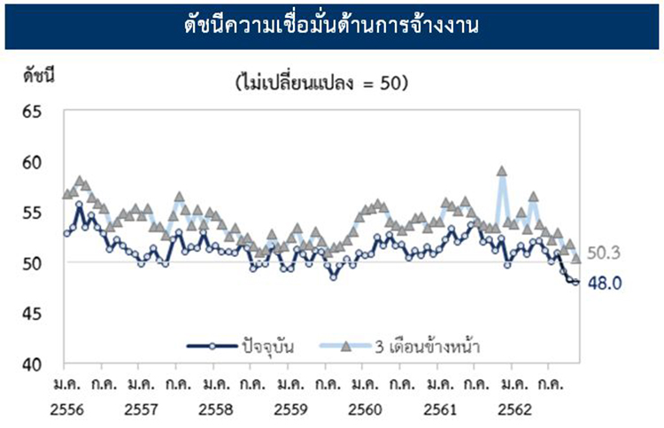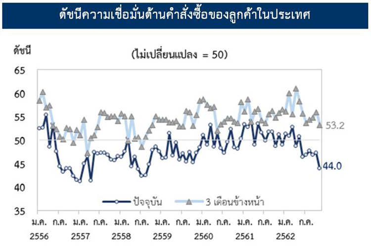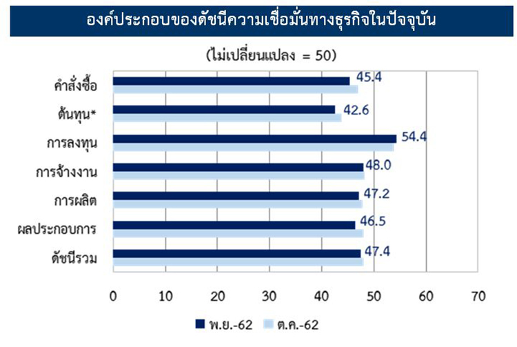 ในเดือน พ.ย. 2562 ดัชนีฯ ปรับลดลงจากเดือนก่อนมาอยู่ที่ 47.4 จากความเชื่อมั่นที่ลดลงของภาคการผลิตเป็นสำคัญ โดยดัชนีฯ ของภาคการผลิตปรับลดลงในเกือบทุกองค์ประกอบและอยู่ต่ำกว่าระดับ 50 เป็นเดือนที่ 8 ติดต่อกัน สะท้อนถึงภาวะในภาคการผลิตโดยรวมที่ยังแย่ลงต่อเนื่อง นำโดยกลุ่มผู้ผลิตยานยนต์ กลุ่มผู้ผลิตเคมี ปิโตรเลียม และกลุ่มยางและพลาสติกที่มีความเชื่อมั่นด้านการผลิต ผลประกอบการ และคำสั่งซื้อที่ลดลงตามอุปสงค์ทั้งในและต่างประเทศที่ชะลอลง รวมถึงปัจจัยเสี่ยงจากสงครามทางการค้าระหว่างสหรัฐฯ และจีนที่ยังไม่ได้ข้อสรุป สำหรับผู้ประกอบการในภาคที่มิใช่การผลิตมีความเชื่อมั่นทรงตัว โดยความเชื่อมั่นด้านคำสั่งซื้อและการลงทุนที่ปรับดีขึ้นเล็กน้อยถูกชดเชยด้วยมุมมองเชิงบวกต่อผลประกอบการที่ปรับลดลง