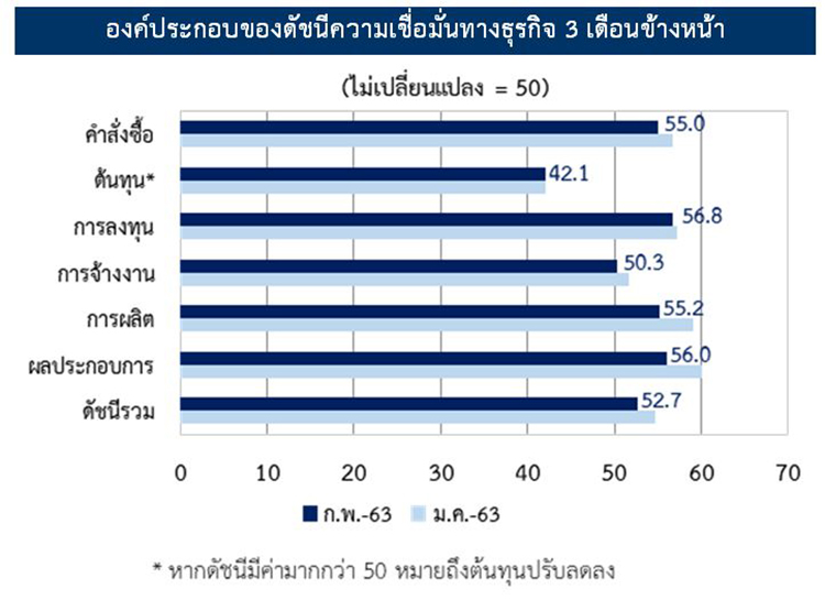 ในอีก 3 เดือนข้างหน้า ดัชนีฯ ปรับตัวลดลงมาอยู่ที่ 52.7 จากมุมมองเชิงบวกที่ปรับลดลงทั้งในภาคการผลิตและภาคที่มิใช่การผลิต โดยดัชนีฯ ย่อยปรับลดลงในเกือบทุกองค์ประกอบ โดยเฉพาะด้านปริมาณการผลิตและผลประกอบการ นำโดยกลุ่มก่อสร้างและกลุ่มผลิตเครื่องจักรและอุปกรณ์ ซึ่งสอดคล้องกับภาวะการลงทุนในกลุ่มดังกล่าวที่ยังไม่ฟื้นตัว อย่างไรก็ตาม ดัชนีฯ และองค์ประกอบส่วนใหญ่ยังอยู่เหนือระดับ 50 สะท้อนถึงความเชื่อมั่นของภาคธุรกิจในภาพรวมที่มองว่ากิจกรรมทางเศรษฐกิจจะขยายตัวได้ในระยะต่อไป