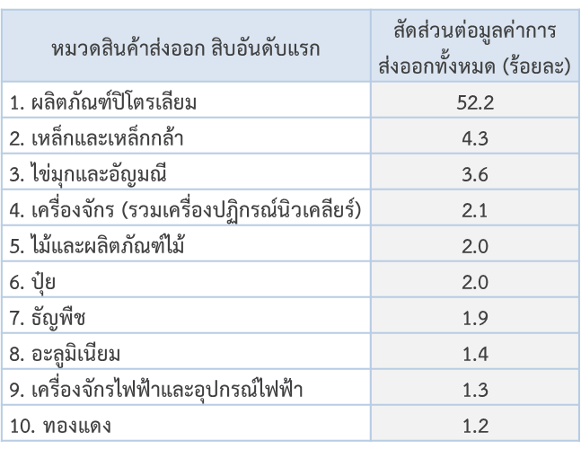 ตารางที่ 1 สัดส่วนมูลค่าสินค้าส่งออกของรัสเซีย จำแนกตามหมวดสินค้า (ปี 2562)