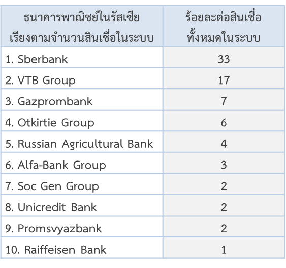 นอกจากนี้ แม้รัสเซียจะมีจำนวนธนาคารมาก แต่ธนาคารที่มีบทบาทสำคัญมีเพียงไม่กี่แห่ง สะท้อนจากมูลค่าสินเชื่อในระบบกว่าร้อยละ 70 กระจุกตัวอยู่กับธนาคารเพียง 10 แห่ง (ตารางที่ 3) และธนาคารที่มีสินทรัพย์มากที่สุด 2 แห่ง ได้แก่ Sberbank และ VTB Group มีสินทรัพย์รวมกันกว่าร้อยละ 60 ของสินทรัพย์รวมในระบบ (13)