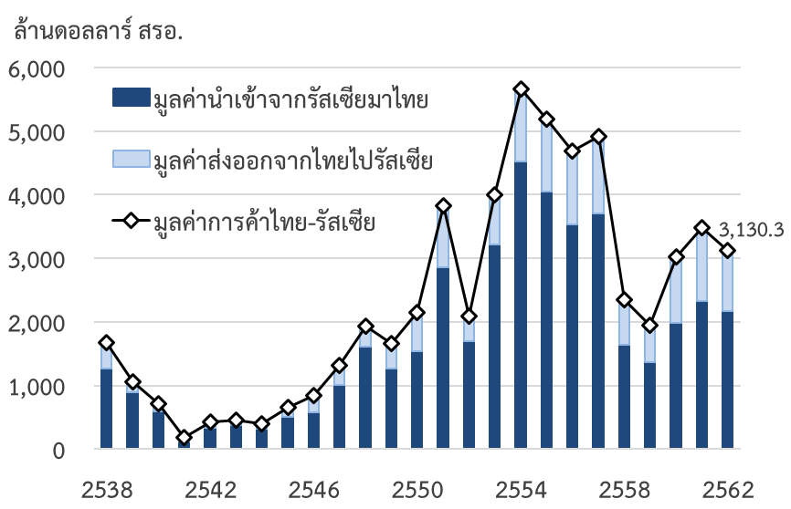 มูลค่าการค้าระหว่างไทยและรัสเซียเพิ่มขึ้นต่อเนื่องในช่วงหลายสิบปีที่ผ่านมา อย่างไรก็ตาม หลังจากที่รัสเซียถูกคว่ำบาตรโดยกลุ่มประเทศตะวันตก และเกิดวิกฤตเงินสกุลรูเบิลอ่อนค่า มูลค่าการค้าระหว่างไทยและรัสเซียได้ปรับลดลงมาก โดยแม้จะค่อย ๆ ฟื้นตัวในเวลาต่อมา แต่ยังไม่กลับเข้าสู่ระดับเดิม ส่วนหนึ่งจากภาพรวมเศรษฐกิจโลกและเศรษฐกิจรัสเซียที่ซบเซาลง (รูปที่ 6) โดย ณ ปี 2562 รัสเซียเป็นคู่ค้าอันดับที่ 29 ของไทย ขณะที่ไทยเป็นคู่ค้าอันดับที่ 47 ของรัสเซีย (17)