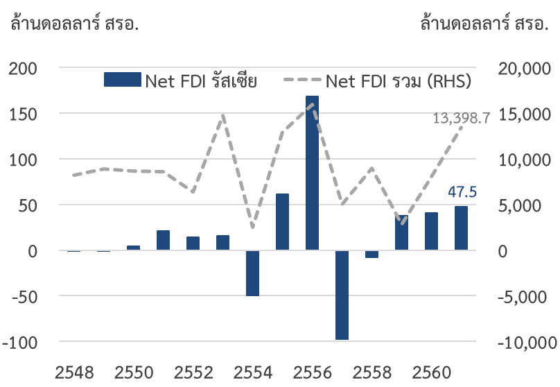 ปัจจุบัน การลงทุนของรัสเซียในไทยยังอยู่ในระดับต่ำเมื่อเทียบกับประเทศคู่ค้าอื่น ๆ สะท้อนจากข้อมูลการลงทุนโดยตรงสุทธิ (Net FDI) ในปี 2561 ที่อยู่ในระดับ 47.5 ล้านดอลลาร์ สรอ. คิดเป็นสัดส่วนเพียงร้อยละ 0.35 ของ Net FDI ทั้งหมดในปีดังกล่าว (รูปที่ 7) อย่างไรก็ตาม การลงทุนของรัสเซียมีแนวโน้มเพิ่มขึ้นในระยะถัดไป ส่วนหนึ่งจากที่รัฐบาลพยายามเชิญชวนนักลงทุนต่างชาติรวมถึงรัสเซียให้มาลงทุนเพิ่มเติมในเขตพัฒนาพิเศษภาคตะวันออก หรือ EEC ในสาขาที่รัสเซียเชี่ยวชาญ มีองค์ความรู้ และสอดคล้องกับอุตสาหกรรมเป้าหมายของไทย (20) อาทิ อุตสาหกรรมการป้องกันประเทศ การผลิตเครื่องมือแพทย์ และดิจิทัล