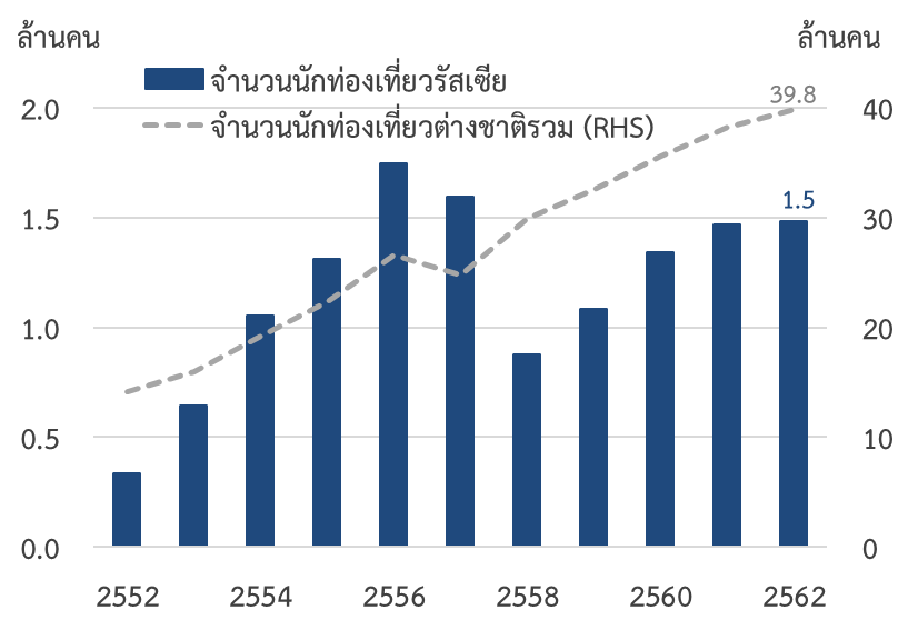 รัสเซียเป็นหนึ่งในตลาดสำคัญของภาคการท่องเที่ยวไทย สะท้อนจากจำนวนนักท่องเที่ยวและรายได้จากนักท่องเที่ยวรัสเซียที่อยู่ในระดับสูงต่อเนื่อง โดยในปี 2557 ก่อนวิกฤตสกุลเงินรูเบิลอ่อนค่าจะเริ่มส่งผลกระทบชัดเจน จำนวนนักท่องเที่ยวรัสเซียที่เดินทางมาไทย มีจำนวน 1.6 ล้านคน สูงเป็นอันดับ 3 รองจากจีนและมาเลเซีย และสร้างรายได้กว่า 3.5 พันล้านดอลลาร์ สรอ. สูงเป็นอันดับสองรองจากจีนเท่านั้น อย่างไรก็ดี เงินสกุลรูเบิลที่อ่อนค่ารุนแรงหลังเหตุการณ์คว่ำบาตรทางเศรษฐกิจ ได้ส่งผลให้จำนวนนักท่องเที่ยวรัสเซียที่เดินทางมาไทยลดลงมาก ตามค่าใช้จ่ายที่สูงขึ้นและปัญหาเศรษฐกิจในประเทศ แต่ในปัจจุบัน จำนวนนักท่องเที่ยวจากรัสเซียได้