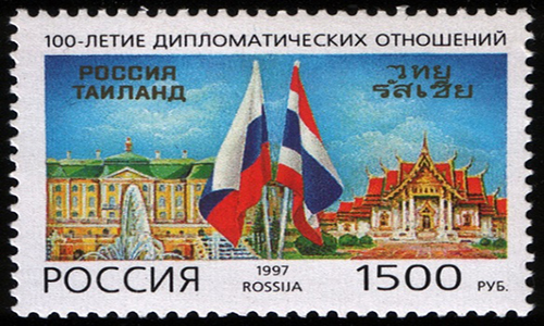 ภาพตราไปรษณียากร 1,500 รูเบิล เนื่องในวาระครบรอบ 100 ปี ความสัมพันธ์ไทย-รัสเซีย (2540)