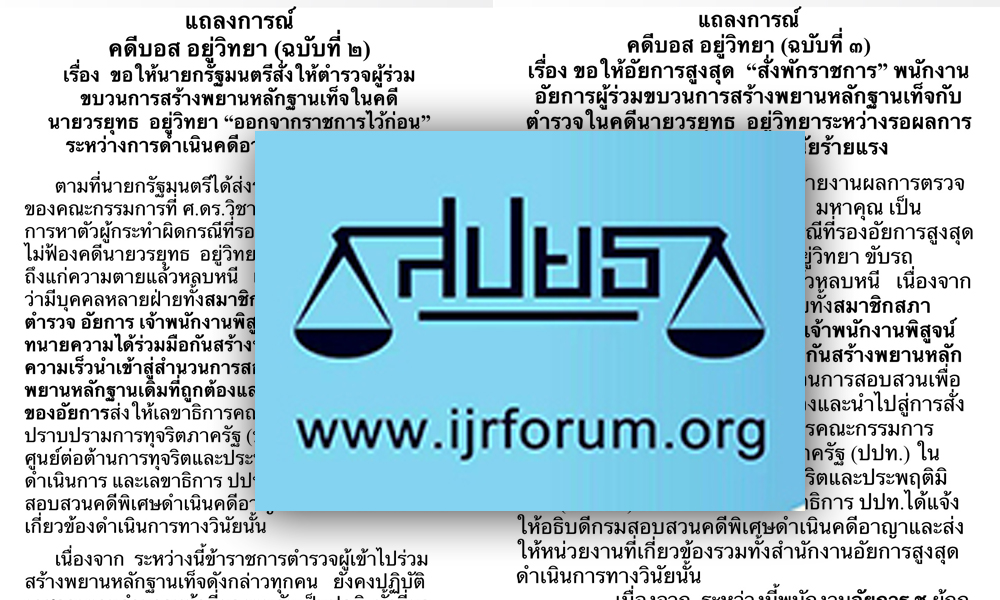 หมายเหตุสำนักข่าวอิศรา (www.isranews.org) เมื่อวันที่ 14 ก.ย.สถาบันเพื่อการปฏิรูปกระบวนการยุติธรรม (สปยธ.) มีแถลงการณ์ 2 ฉบับเพื่อขอให้นายกรัฐมนตรี และอัยการสูงสุด สั่งพักราชการบุคคลที่เกี่ยวข้องกับกรณีอัยการสั่งไม่ฟ้องคดีนายวรยุทธ อยู่วิทยา หรือ บอส ที่ขับรถชนตำรวจเสียชีวิตเมื่อปี 2555 โดยมีรายละเอียด ดังนี้