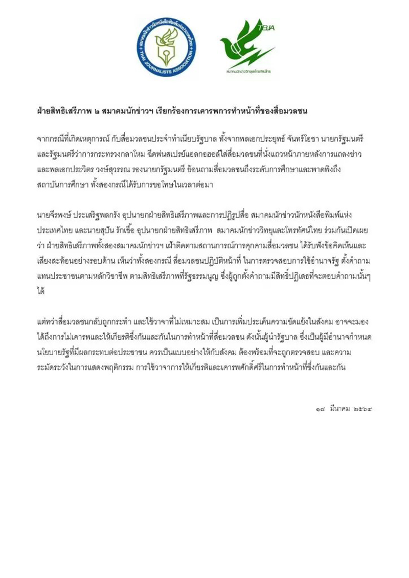 โดย นายจีรพงษ์ ประเสริฐพลกรัง อุปนายกฝ่ายสิทธิเสรีภาพและการปฏิรูปสื่อ สมาคมนักข่าวนักหนังสือพิมพ์แห่งประเทศไทย และนายสุปัน รักเชื้อ อุปนายกฝ่ายสิทธิเสรีภาพ สมาคมนักข่าววิทยุและโทรทัศน์ไทย ร่วมกันเปิดเผยว่า ฝ่ายสิทธิเสรีภาพทั้งสองสมาคมนักข่าวฯ เฝ้าติดตามสถานการณ์การคุกคามสื่อมวลชน ได้รับฟังข้อคิดเห็นและเสียงสะท้อนอย่างรอบด้าน เห็นว่าทั้งสองกรณี สื่อมวลชนปฏิบัติหน้าที่ ในการตรวจสอบการใช้อำนาจรัฐ ตั้งคำถามแทนประชาชนตามหลักวิชาชีพ ตามสิทธิเสรีภาพที่รัฐธรรมนูญ ซึ่งผู้ถูกตั้งคำถามมีสิทธิ์ปฏิเสธที่จะตอบคำถามนั้นๆได้