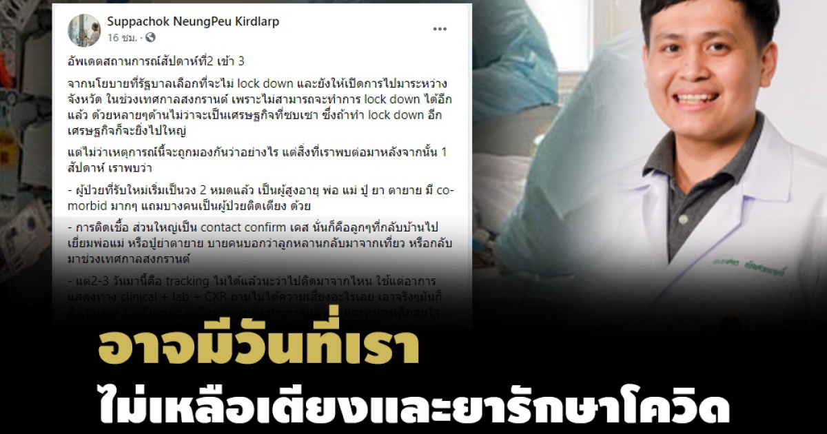 "...และมันก็เกิดวงจรที่ไม่ควรเกิด=> เตียงไม่พอ => admit ไม่ได้ => รออยู่บ้าน => อาการหนักเพราะ delay ยา=> ต้องใช้ยาเยอะกว่าเดิมและใช้ ICU => กินเตียงนาน => เตียงเต็มเตียงไม่พอ วนไปเป็นนิรันดร์ สถานการณ์ที่เป็นแบบนี้ ยาที่เริ่มจำกัดจำเขี่ย เราก็ยังได้ยิน timeline ประหลาดๆเช่น บุคคลชั้นสูงของบางกิจการติดเชื้อเป็นร้อยเพราะไปจ้างสาวPR มาจัดงานเลี้ยงในช่วงเวลาแบบนี้ เป็นต้น..."
