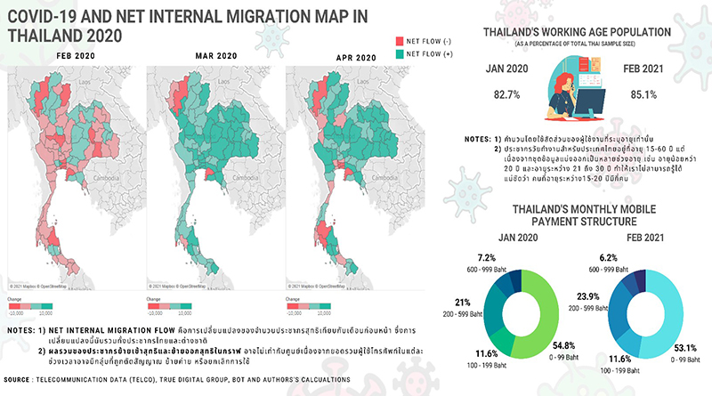 ผู้เขียนได้ใช้ฐานข้อมูล Telco ของ True Digital Group[6] ของผู้ใช้มือถือประมาณ 20 ล้านคน ช่วง 1 ม.ค. 62 - 28 ก.พ. 64 เป็นข้อมูล Aggregate ไม่แยกแยะข้อมูลรายบุคคล เพื่อศึกษาพฤติกรรมการย้ายคืนถิ่นของแรงงานที่ครอบคลุมช่วงล็อกดาวน์ครั้งแรก เริ่ม 26 มี.ค. 63 และช่วงซอฟล็อกดาวน์ครั้งสอง มีข้อค้นพบดังนี้