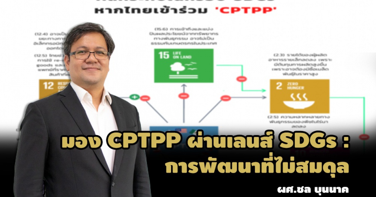 "...ประเด็นสำคัญเมื่อมอง CPTPP เทียบกับกรอบ SDGs พบว่า ความตกลง CPTPP นั้นยังค่อนข้างขัดแย้งกับ SDGs อย่างเห็นได้ชัด เหตุผลหลักก็คือ CPTPP นั้นสะท้อนแนวคิดเกี่ยวกับการพัฒนาที่ขาดความสมดุล คือ มองเพียงมิติเศรษฐกิจในระดับมหาภาคเท่านั้น แต่ขาดการมองผลกระทบที่จะเกิดขึ้นกับมิติสังคมและสิ่งแวดล้อม..."