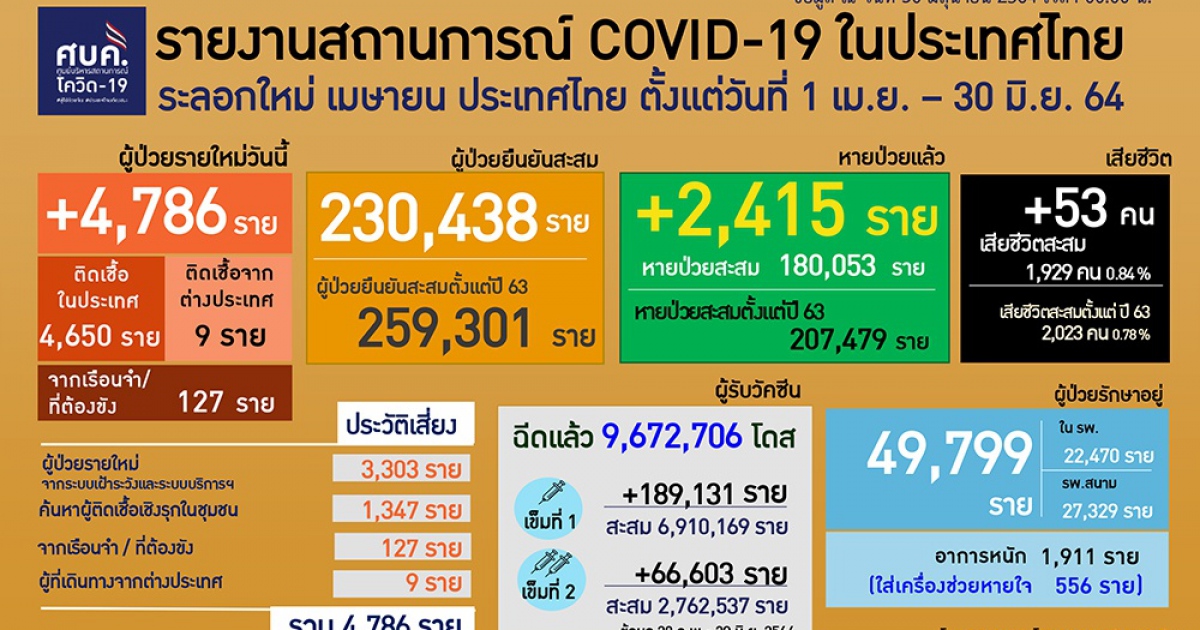 สำนักข่าวอิศรา (www.isranews.org) รายงานว่า เมื่อวันที่ 30 มิ.ย.2564 เวลา 12.30 น. นพ.ทวีศิลป์ วิษณุโยธิน โฆษกศูนย์บริหารสถานการณ์โควิด (ศบค.) รายงานสถานการณ์ประจำวัน โดยพบผู้ติดป่วยรายใหม่ 4,786 ราย แบ่งเป็นการติดเชื้อในประเทศ 4,650 ราย เกิดจากระบบเฝ้าระวังและระบบบริการฯ 3,303 ราย เกิดจากการค้นหาเชิงรุกและพบการติดเชื้อในชุมชน 1,347 ราย ติดเชื้อภายในเรือนจำ 127 ราย และอีก 9 ราย เดินทางกลับมาจากต่างประเทศ รวมผู้ป่วยสะสม 259,301 ราย หายป่วยเพิ่ม 2,415 ราย อยู่ระหว่างรักษาตัวในโรงพยาบาล 49,799 ราย โดยในจำนวนนี้มีอาการหนัก 1,911 ราย และใส่ท่อช่วยหายใจ 556 ราย เสียชีวิตเพิ่ม 53 ราย รวมเสียชีวิตสะสม 2,023 ราย