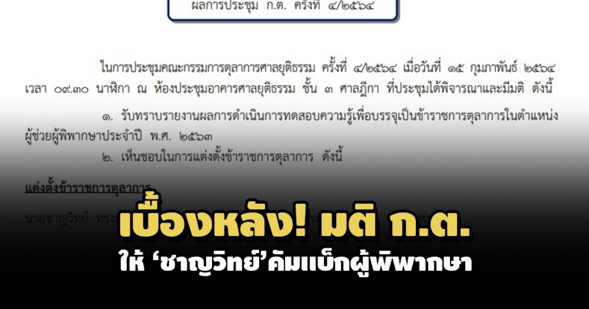 เบื้องหลัง! โปรดเกล้าฯ ‘ชาญวิทย์ ทรงสว่าง’ กลับเข้ารับราชการเป็นผู้พิพากษาหัวหน้าคณะในศาลแพ่ง เหตุเคยถูกลงโทษไล่ออก กระทำผิดวินัยร้ายแรงปี 60 ถูกกล่าวหาเบิกค่าเบี้ยเลี้ยงซ้ำซ้อน เจ้าตัวอุทธรณ์ ก.ต. มีมติข้างมาก 13:2 เสียง เปลี่ยนคำสั่งลงโทษแค่งดเลื่อนตำแหน่ง 3 ปี
