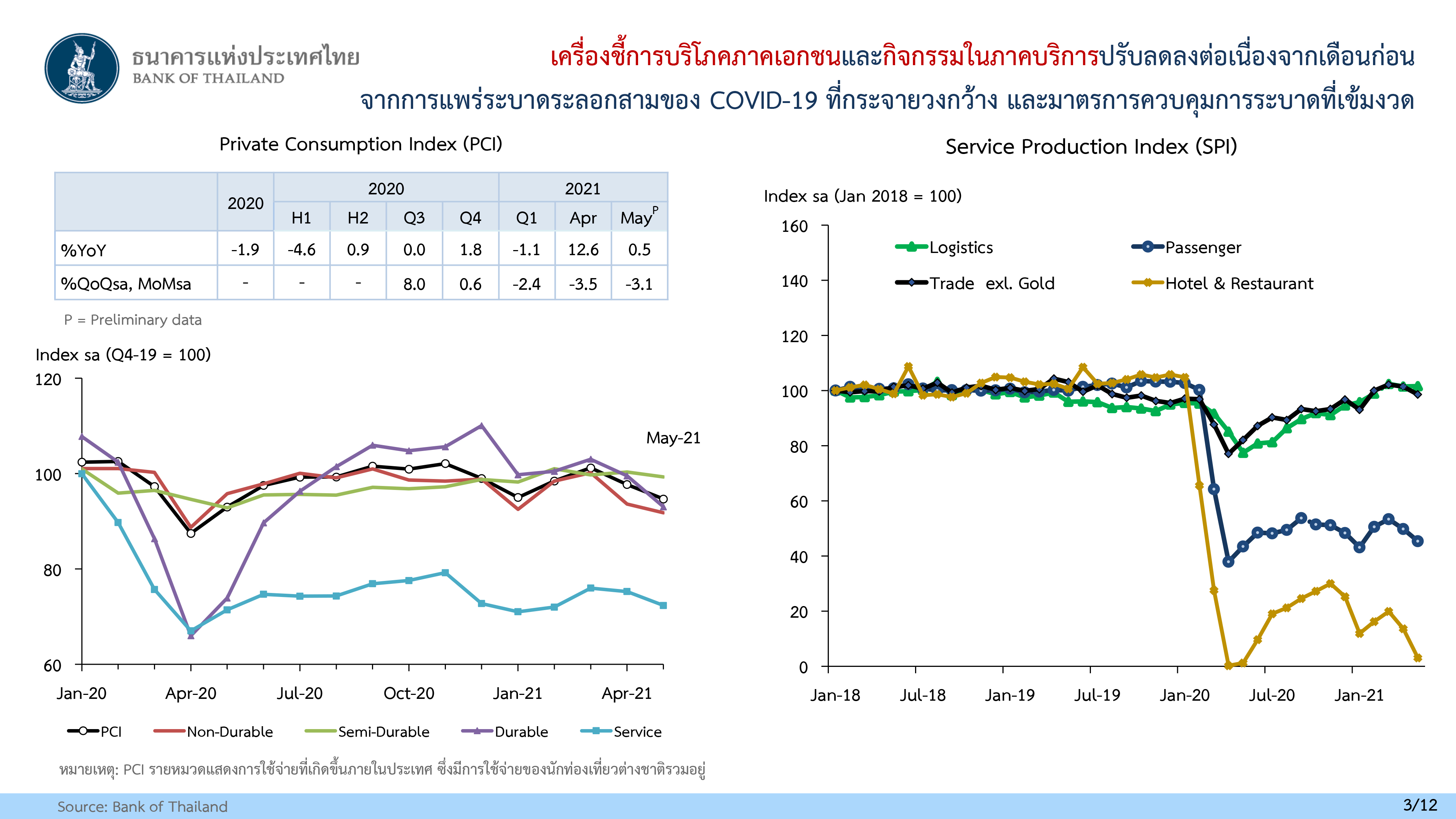 เครื่องชี้การบริโภคภาคเอกชนที่ขจัดปัจจัยฤดูกาลแล้วปรับลดลงต่อเนื่อง โดยเครื่องชี้การบริโภคในเดือน พ.ค.2564 หดตัว -3.1% จากเดือนก่อน และเป็นการหดตัวในทุกหมวดการใช้จ่าย โดยเป็นผลจากการแพร่ระบาดระลอกสามของ COVID-19 ที่ต่อเนื่อง และมาตรการควบคุมการระบาดที่เข้มงวด ซึ่งส่งผลให้กิจกรรมทางเศรษฐกิจ รายได้ของภาคครัวเรือน และความเชื่อมั่นผู้บริโภคปรับลดลง แม้มาตรการภาครัฐจะช่วยพยุงกำลังซื้อภาคครัวเรือนได้บางส่วน