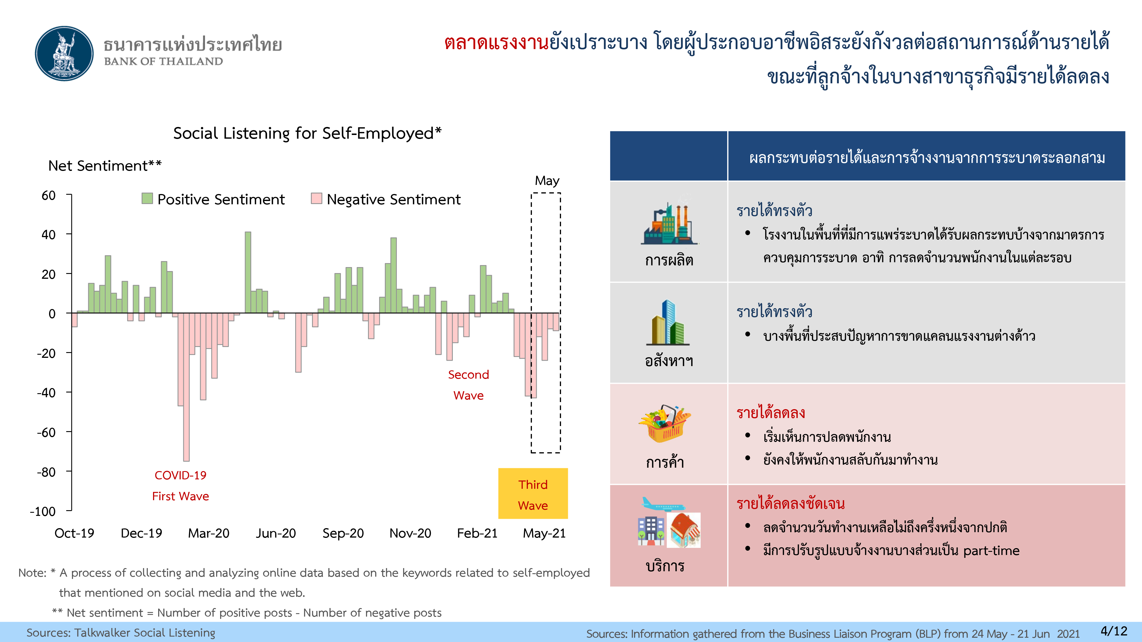 ด้านตลาดแรงงานยังคงเปราะบางอย่างต่อเนื่องจากการแพร่ระบาดระลอกสาม โดยผู้ประกอบอาชีพอิสระกังวลต่อสถานการณ์รายได้ และจากการสอบถามผู้ประกอบการพบว่า แม้แรงงานในภาคผลิตจะมีรายได้ทรงตัว แต่มีโรงงานในบางพื้นที่ที่พบคนงานติดโควิด-19 ต้องย้ายการผลิตไปยังโรงงานแห่งอื่น ส่วนภาคอสังหาริมทรัพย์นั้น หลายพื้นที่ยังมีปัญหาขาดแคลนแรงานต่างด้าว และเมื่อรัฐบาลมีมาตรการเข้มงวด โดยปิดแคมป์แรงงานขนาดใหญ่ ซึ่งต้องติดตามผลกระทบที่เกิดขึ้นต่อไป