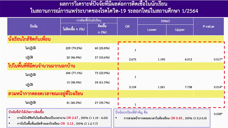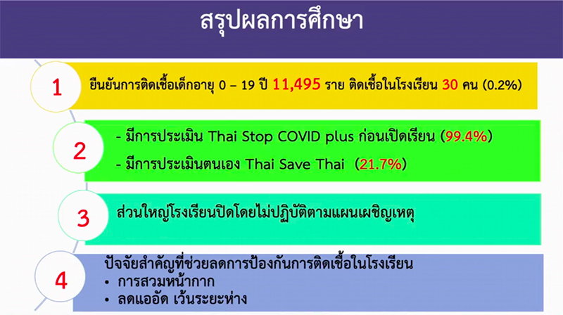 "สรุปผลการศึกษาได้ว่าเด็กอายุ 0-19 ปี จำนวน 11,495 คน ติดเชื้อในโรงเรียน 30 คน คิดเป็น 0.2% และมีปัจจัยสำคัญในการป้องกันการติดเชื้อในโรงเรียนคือการสวมหน้ากากอนามัยหรือหน้ากากผ้า ลดความแออัด และการเว้นระยะห่าง แสดงให้เห็นว่าการควบคุมมาตรการภายในโรงเรียนสามารถทำได้ดี การสั่งปิดโรงเรียนจึงอาจไม่ใช่คำตอบที่ดีที่สุด" นพ.สราวุฒิ กล่าว