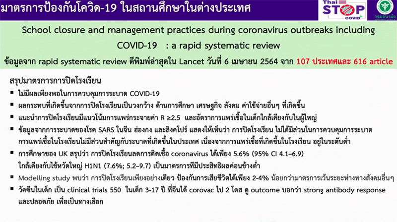 โดย นพ.สราวุฒิ ได้ยกตัวอย่างผลการศึกษาในการใช้มาตรการคุมโควิดของสถานศึกษาในต่างประเทศ ที่ตีพิมพ์ล่าสุดใน Lancet ว่า ข้อมูลจากจีน ฮ่องกง และสิงคโปร์ แสดงให้เห็นว่าการปิดโรงเรียนไม่ได้มีส่วนในการควบคุมการระบาด เนื่องจากการแพร่เชื้อในโรงเรียนอยู่ในระดับต่ำ ซึ่งไม่มีส่วนสำคัญต่อการระบาดที่เกิดขึ้นในประเทศ ขณะที่มีการศึกษาจากสหราชอาณาจักรด้วยว่า การปิดโรงเรียนช่วยลดการติดเชื้อโควิดได้เพียง 5.6% ใกล้เคียงกับไข้หวัดใหญ่ ถือว่าเป็นมาตรการที่มีประสิทธิผลค่อนข้างต่ำ