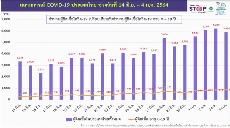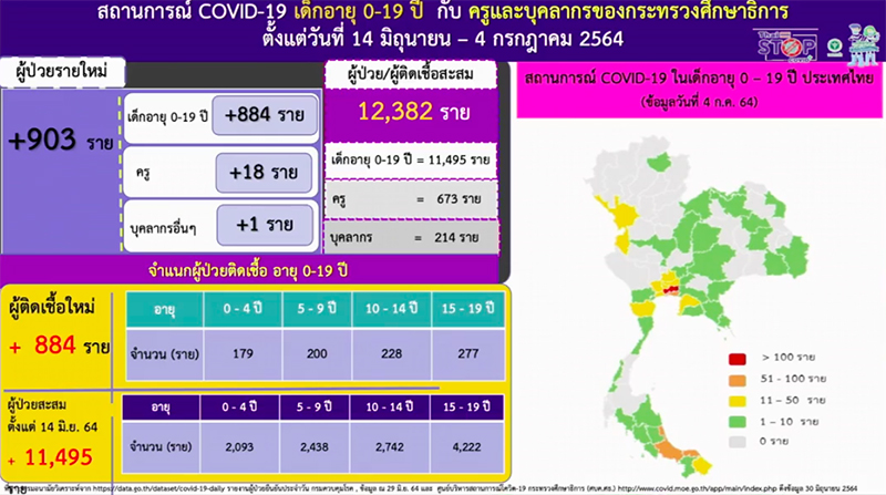 ผู้สื่อข่าวรายงานว่า เมื่อวันที่ 6 มิ.ย.2564 นพ.สราวุฒิ บุญสุข รองอธิบดีกรมอนามัย แถลงข่าวประเด็นการติดเชื้อในโรงเรียน ศูนย์เด็กเล็ก และการดูแลเด็กปฐมวัย ว่า สถานการณ์การระบาดในปัจจุบันพบเด็ก ครู และบุคลากรของกระทรวงศึกษาธิการ ติดโควิดในช่วงวันที่ 14 มิ.ย.- 4 ก.ค.2564 จำนวน 903 ราย แบ่งเป็น เด็กอายุ 0-19 ปี จำนวน 884 ราย ครู 18 ราย และบุคลากรอื่นๆ 1 ราย รวมผู้ติดเชื้อสะสม 12,382 ราย