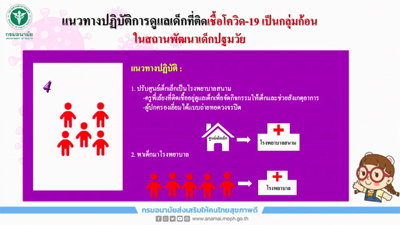 กรณีที่มีเด็กในสถานพัฒนาเด็กปฐมวัยติดเชื้อ ต้องทำอย่างไรนั้น นพ.สราวุฒิ กล่าวว่า จะต้องปรับศูนย์เด็กเล็กเป็นโรงพยาบาลสนาม โดยผู้ปกครองสามารถเข้ามาดูแลได้ แต่ต้องปฏิบัติตามมาตรการทางการแพทย์อย่างเคร่งครัด เนื่องจากเด็กที่มีอายุน้อยเรื่องสุขภาพกายและใจเป็นสิ่งที่สำคัญมาก รวมถึงยังมีการเตรียมพร้อมส่งต่อเด็กไปยังโรงพยาบาลเมื่อมีอาการมากขึ้นด้วย