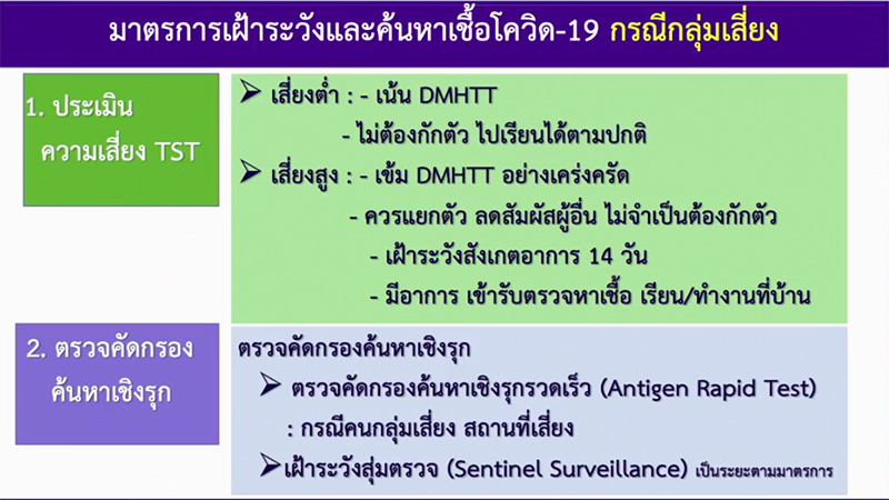 สำหรับมาตรการป้องกันการแพร่ระบาดในสถานศึกษา ถ้าเสี่ยงต่ำให้ปฏิบัติตามมาตรการส่วนบุคคลของกระทรวงสาธารณสุข (สธ.) หรือ DMHTT ได้แก่ การสวมหน้ากากอยนามัยหรือหน้ากากผ้า การเว้นระยะห่าง หมั่นล้างมือ การตรวจวัดอุณหภูมิ และแสกนไทยชนะก่อนเข้าออกสถานที่ โดยไม่ต้องกักตัว และไปเรียนได้ตามปกติ แต่หากเป็นกลุ่มเสี่ยงสูง ให้ปฏิบัติตาม DMHTT อย่างเคร่งครัดและให้แยกกักตัว