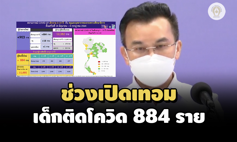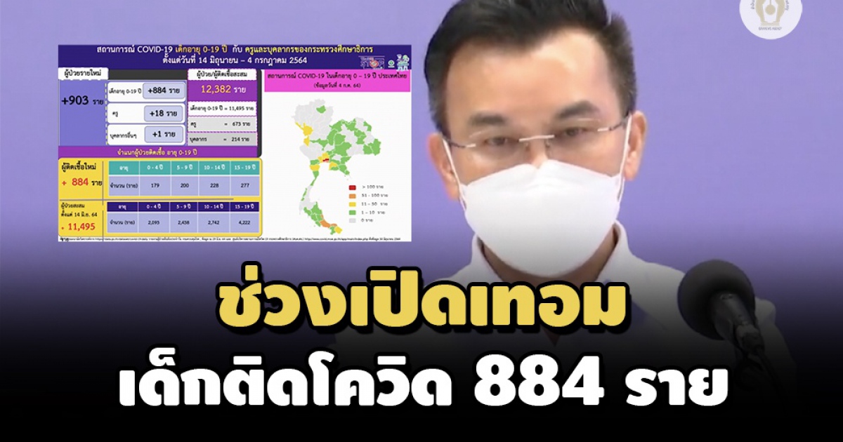สธ.เผยช่วงเปิดเทอมที่ผ่านมา พบเด็กติดเชื้อ 884 ราย มีอัตราการติดเชื้ออยู่ที่ 0.2% ถือว่าพบเพิ่มขึ้น แต่ไม่ต่างจากเดิมมาก ซึ่งโดยส่วนใหญ่พบการติดเชื้อมาจากครอบครัวและชุมชน ไม่ใช่โรงเรียน ชี้การปิดโรงเรียนอาจไม่ใช่คำตอบที่ดีที่สุด แนะให้ทำตามมาตรการ DMHTT-ประเมินความเสี่ยงผ่านไทยเซฟไทย และ Thai Stop Covid +