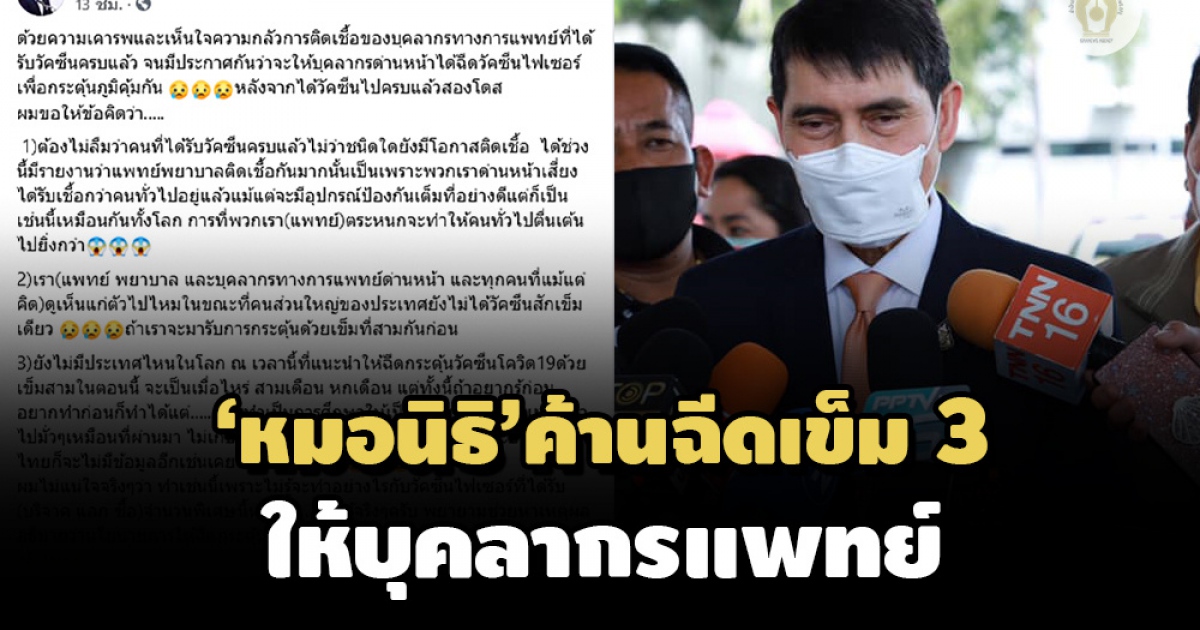 'หมอนิธิ' แสดงความเห็นส่วนตัว ค้านแนวทางฉีดวัคซีนเข็มที่ 3 ให้บุคลากรแพทย์ ขณะที่คนส่วนใหญ่ยังไม่ได้รับวัคซีน