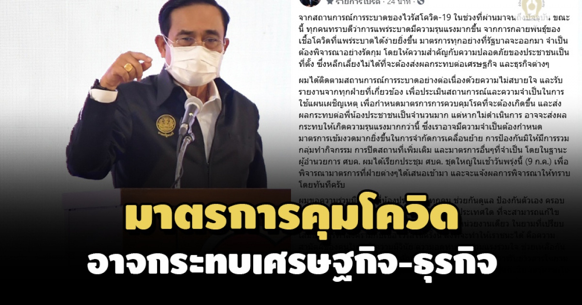 ผู้สื่อข่าวรายงานว่า เมื่อวันที่ 8 ก.ค.2564 พล.อ.ประยุทธ์ จันทร์โอชา นายกรัฐมนตรี และ รมว.กลาโหม โพสต์ข้อความผ่านเฟซบุ๊ก ประยุทธ์ จันทร์โอชา Prayut Chan-o-cha ว่า จากสถานการณ์การระบาดของโควิดในช่วงที่ผ่านมาจนถึงปัจจุบัน ขณะนี้ทุกคนทราบดีว่าการแพร่ระบาดมีความรุนแรงมากขึ้น จากการกลายพันธุ์ของเชื้อโควิดที่แพร่ระบาดได้ง่ายยิ่งขึ้น มาตรการทุกอย่างที่รัฐบาลจะออกมา จำเป็นต้องพิจารณาอย่างรัดกุม โดยให้ความสำคัญกับความปลอดภัยของประชาชนเป็นที่ตั้ง ซึ่งหลีกเลี่ยงไม่ได้ที่จะต้องส่งผลกระทบต่อเศรษฐกิจ และธุรกิจต่างๆ