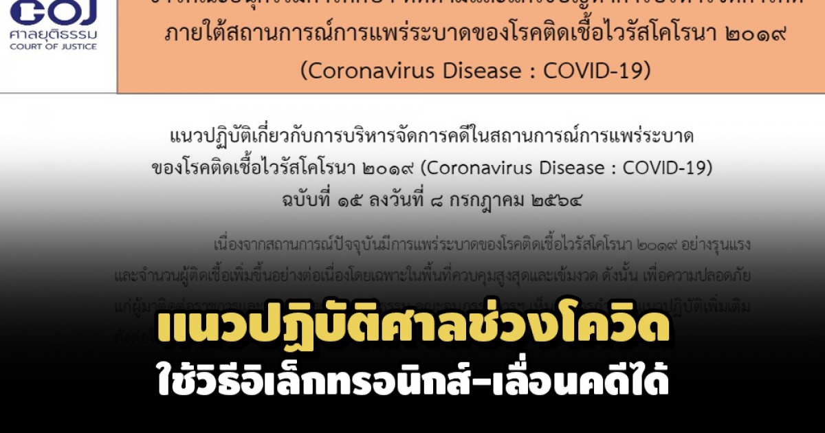 ผู้สื่อข่าวรายงานว่า เมื่อวันที่ 8 ก.ค. 2564 สำนักงานศาลยุติธรรม เผยแพร่แนวปฏิบัติเกี่ยวกับการบริหารจัดการคดีในสถานการณ์การแพร่ระบาดของโรคโควิด-19 ฉบับที่ 15 ลงวันที่ 8 ก.ค. 2564 กรณีโรคโควิด-19 ที่มีการระบาดอย่างรุนแรงและจำนวนผู้ติดเชื้อเพิ่มขึ้นอย่างต่อเนื่อง โดยเฉพาะในพื้นที่ควบคุมสูงสุดและเข้มงวด