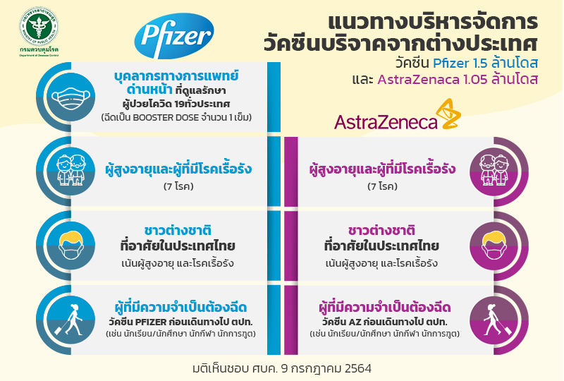 กรมควบคุมโรค เผยแนวทางการบริหารจัดการวัคซีนไฟเซอร์และแอสตร้าเซนเนก้า ที่ได้รับบริจาคจากต่างประเทศ พร้อมส่งมอบไปยังพื้นที่ต่างๆตามที่ ศบค. กำหนด ฉีดให้บุคลากรด่านหน้า ผู้สูงอายุ และผู้ป่วย 7 กลุ่มโรคเรื้อรัง ทั้งชาวไทยและชาวต่างชาติที่อาศัยอยู่ในประเทศไทย
