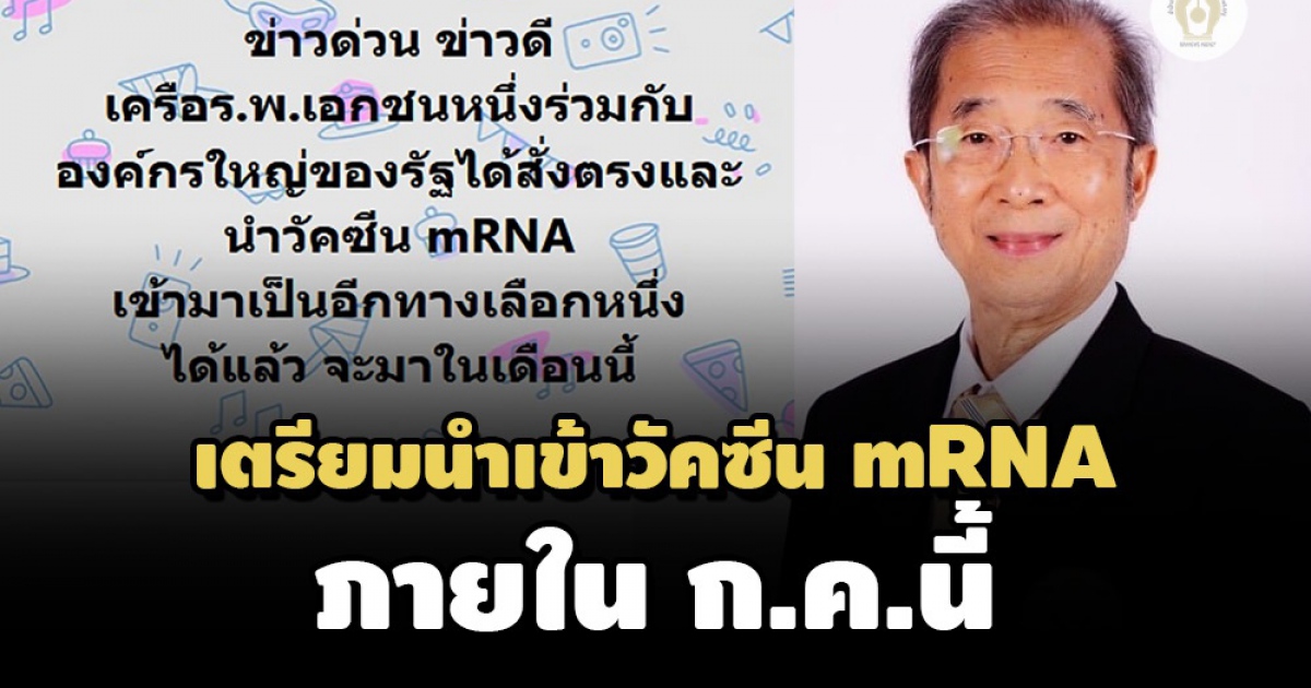 ผู้สื่อข่าวรายงานว่า เมื่อวันที่ 12 ก.ค.2564 ศ.คลินิกเกียรติคุณ นพ.อำนาจ กุสลานันท์ กรรมการแพทยสภา อดีตนายกแพทยสภา โพสต์ข้อความผ่านเฟซบุ๊ก อำนาจ กุสลานันท์ ระบุว่า ข่าวด่วน ข่าวดี เครือ รพ.เอกชนหนึ่งร่วมกับองค์กรใหญ่ของรัฐได้สั่งตรงและนำวัคซีน mRNA เข้ามาเป็นอีกทางเลือกหนึ่งได้แล้ว จะมาในเดือนนี้