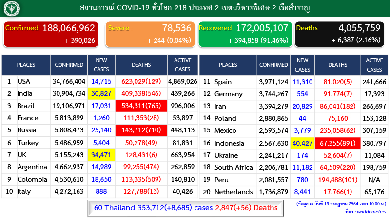 ขณะที่สถานการณ์ทั่วโลกพบผู้ป่วยเพิ่ม 390,026 ราย รวม 188,066,962 ราย อาการหนัก 78,536 ราย หายป่วย 172,005,107 ราย เสียชีวิต 4,055,759 ราย โดยสหรัฐอเมริกาพบผู้ป่วยเพิ่ม 14,715 ราย รวม 34,766,404 ราย เสียชีวิตเพิ่ม 129 ราย รวม 623,029 ราย อินเดีย พบเพิ่ม 30,827 ราย รวม 30,904,734 ราย เสียชีวิตเพิ่ม 546 ราย รวม 409,338 ราย บราซิล พบเพิ่ม 17,031 ราย รวม 19,106,971 ราย เสียชีวิตเพิ่ม 765 ราย รวม 534,311 ราย ส่วนไทยอยู่ในอันดับที่ 60 ของโลก