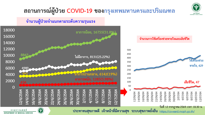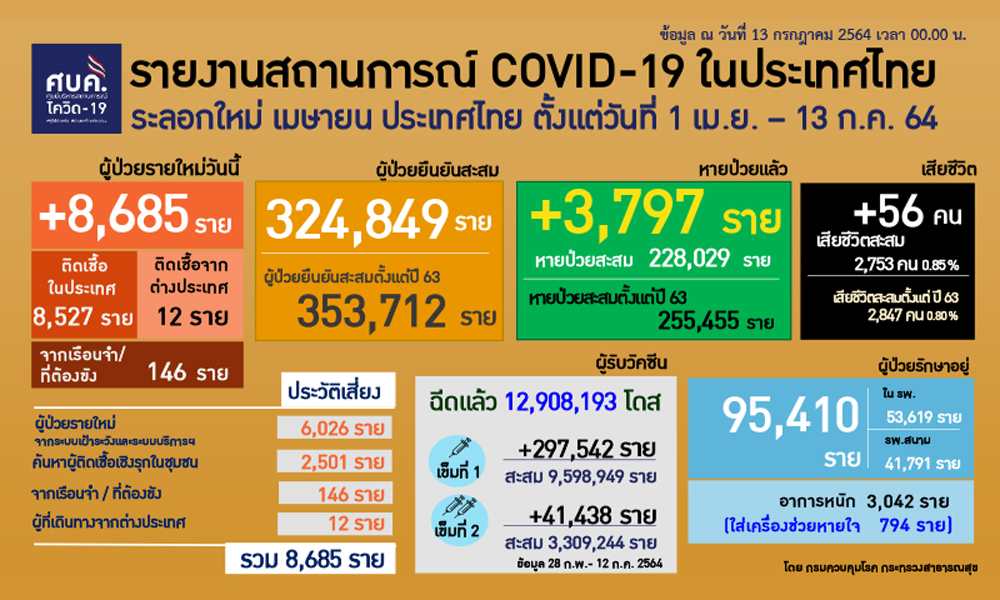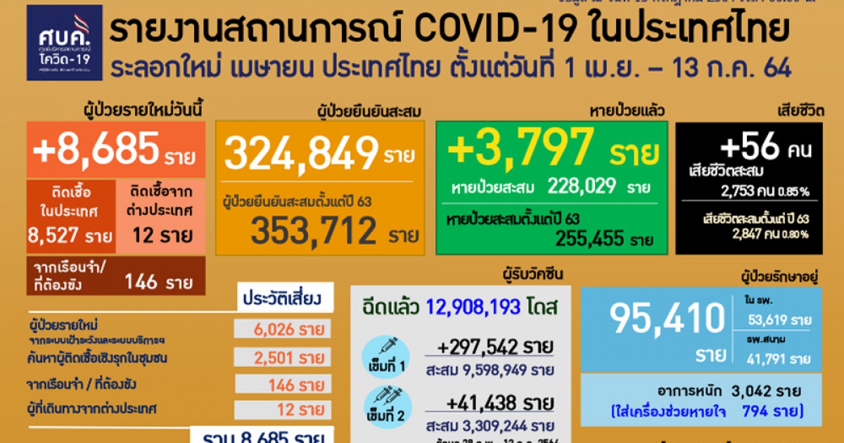 สำนักข่าวอิศรา (www.isranews.org) รายงานว่า เมื่อวันที่ 13 ก.ค. ศูนย์บริหารสถานการณ์โควิด (ศบค.) รายงานสถานการณ์ประจำวัน โดยพบผู้ 8,685 ราย เกิดจากระบบเฝ้าระวังและระบบบริการฯ 6,026 ราย เกิดจากการค้นหาเชิงรุกในชุมชน 2,501 ราย ติดเชื้อภายในเรือนจำ 146 ราย และอีก 12 ราย เดินทางกลับมาจากต่างประเทศ รวมผู้ป่วยสะสม 353,712 ราย หายป่วยเพิ่ม 3,797 ราย อยู่ระหว่างรักษาตัวในโรงพยาบาล 95,410 ราย โดยในจำนวนนี้มีอาการหนัก 3,042 ราย และใส่ท่อช่วยหายใจ 794 ราย เสียชีวิตเพิ่ม 56 ราย รวมเสียชีวิตสะสม 2,753 ราย