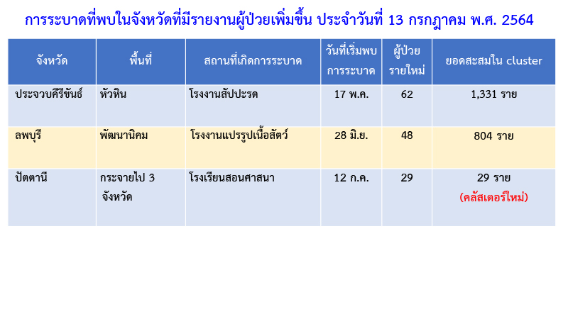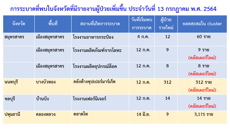 สำหรับการระบาดในต่างจังหวัด พบคลัสเตอร์ใหม่ 5 แห่ง กระจาย 4 จังหวัด ได้แก่ จ.สมุทรสาคร พบคลัสเตอร์โรงงาน 2 แห่ง คือ โรงงานผลิตภัณฑ์จากโลหะ พบผู้ป่วย 9 ราย โรงงานผลิตอุปกรณ์ล็อค พบผู้ป่วย 8 ราย จ.นนทบุรี พบคลัสเตอร์ คลังห้างซุปเปอร์มาร์เก็ต พบผู้ป่วย 312 ราย จ.ชลบุรี คลัสเตอร์โรงงานเฟอร์นิเจอร์ พบผู้ป่วย 14 ราย และ จ.ปัตตานี คลัสเตอร์โรงเรียนสอนศาสนา พบผู้ป่วย 29 ราย