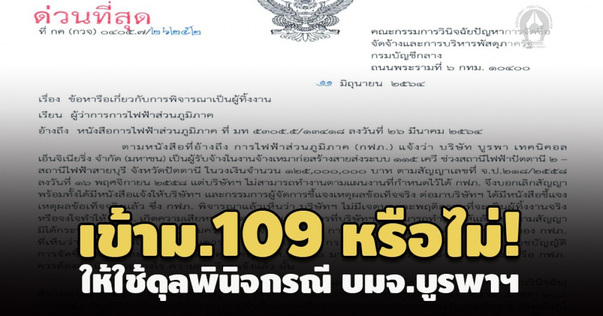 เปิดหนังสือลับ! คกก.วินิจฉัยปัญหาจัดซื้อจัดจ้างฯ แจ้งตอบกลับ กฟภ. ให้ใช้ดุลพินิจพิจารณากรณี บมจ.บูรพาเทคนิคคอลฯ ทิ้งงานไฟฟ้าปัตตานี 125 ล้าน เข้าข่าย ม.109 หรือไม่ ก่อนชงเรื่องปลัดคลังฯ ชี้ขาดขึ้นบัญชีดำแจ้งเวียนหน่วยงานรัฐ