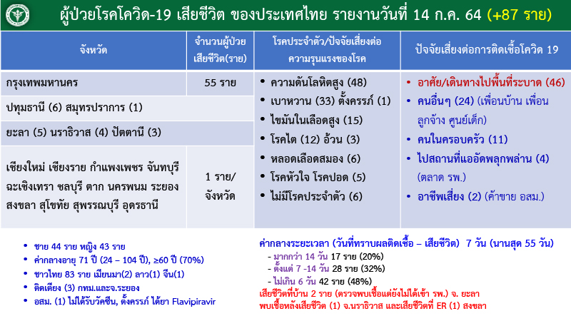 สำนักข่าวอิศรา (www.isranews.org) รายงานว่า เมื่อวันที่ 14 ก.ค.2564 พญ.อภิสมัย ศรีรังสรรค์ รองโฆษกศูนย์บริหารสถานการณ์โควิด (ศบค.) รายงานสถานการณ์ประจำวัน โดยพบผู้ติดเชื้อรายใหม่ 9,317 ราย เกิดจากระบบเฝ้าระวังและระบบบริการฯ 9,180 ราย เกิดจากการค้นหาเชิงรุกในชุมชน 7,159 ราย ติดเชื้อภายในเรือนจำ 129 ราย และอีก 8 ราย เดินทางกลับมาจากต่างประเทศ รวมผู้ป่วยสะสม 363,029 ราย หายป่วยเพิ่ม 5,129 ราย อยู่ระหว่างรักษาตัวในโรงพยาบาล 99,511 ราย โดยในจำนวนนี้มีอาการหนัก 3,201 ราย และใส่ท่อช่วยหายใจ 828 ราย เสียชีวิตเพิ่ม 87 ราย รวมเสียชีวิตสะสม 2,934 ราย