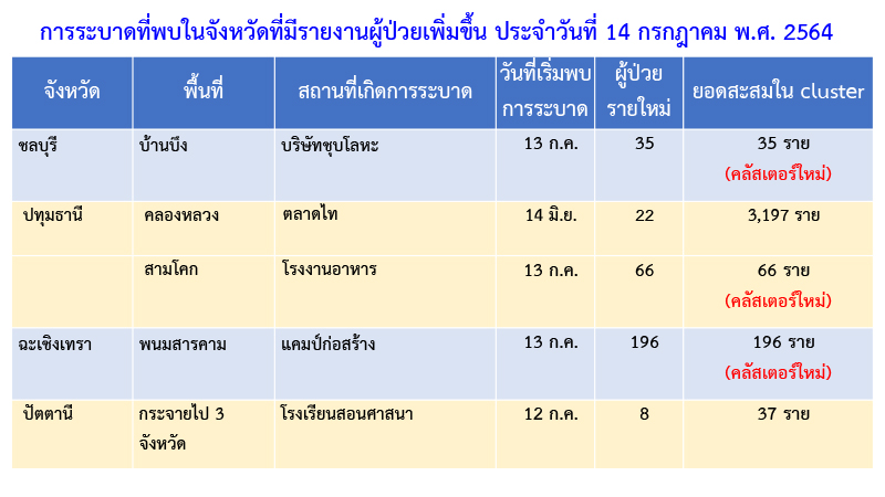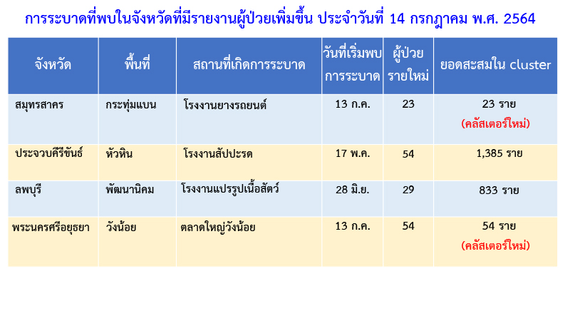 สำหรับการระบาดในกทม. วันนี้ไม่พบคลัสเตอร์ใหม่ แต่ยังคงต้องเฝ้าระวังอีก 130 แห่ง ส่วนต่างจังหวัด พบคลัสเตอร์ใหม่ 5 แห่ง กระจาย 5 จังหวัด ติดเชื้อรวม 374 ราย แบ่งเป็น จังหวัดชลบุรี พบคลัสเตอร์ใหม่ในบริษัทชุบโลหะ อ.บ้านบึง ติดเชื้อ 35 ราย จังหวัดปทุมธานี พบคลัสเตอร์ใหม่โรงงานอาหาร อ.สามโคก ติดเชื้อ 66 ราย จังหวัดฉะเชิงเทรา พบคลัสเตอร์ใหม่ในแคมป์ก่อสร้าง อ.พนมสารคาม ติดเชื้อ 196 ราย จังหวัดสมุทรสาคร พบคลัสเตอร์ใหม่ในโรงงานรถยนต์ อ.กระทุ่มแบน ติดเชื้อ 23 ราย และจังหวัดพระนครศรีอยุธยา พบคลัสเตอร์ใหม่ในตลาดใหญ่วังน้อย อ.วังน้อย ติดเชื้อ 54 ราย