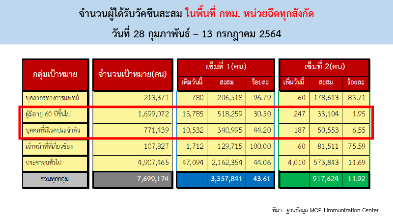 ทั้งนี้ พื้นที่ กทม. ได้ฉีดวัคซีนเข็มแรกแล้ว 43.61% เข็มสอง 11.92% ซึ่งเป้าหมายการควบคุมการแพร่ระบาดต้องเป็นตัวเลข 70% ของประชากร ยังต้องระดมฉีดมากขึ้น กรมควบคุมโรคจึงมีแผนกระจายวัคซีนสัปดาห์นี้และต้นสัปดาห์หน้า 5 แสนโดส และจะเพิ่มให้ได้ 1 ล้านโดส ภายใน 2 สัปดาห์นี้ด้วย